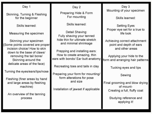 aspects (skinning- fleshing -turning - prepping- mounting) in a 2-3 day class, to