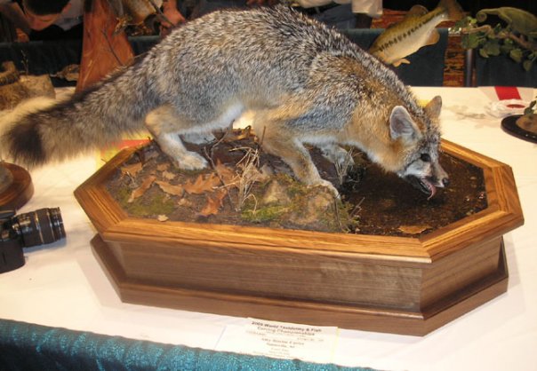 So I went home with my new knowledge, and began working on my own competition piece. I had an idea for a grey fox "drinking" at the edge of a water puddle. I hand carved a custom form, just like I did in Canada, and even sculpted and cast a head for the fox. It turned out great.. Somewhere I have photos of the fox mounting process, but they are somewhere on a CD from when my old computer crashed this summer .. I will post them once I dig them out, but for now, here is a picture of the completed mount..