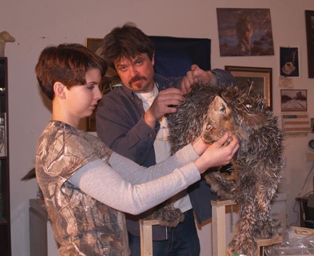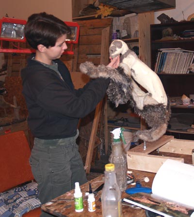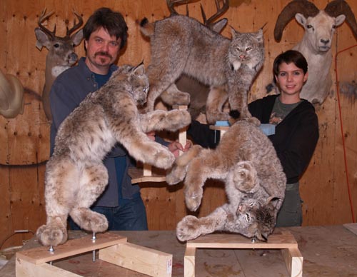 So up to Canada I went, and we spent a week working on three canadian lynx - a mother, and two juvenille kittens. Yes, we did THREE competition mounts all in the course of one short week. The mother cat was mounted on one of Ken's commercial forms, slightly altered. The jumping kitten was mounted on another one of Ken's commercial forms, though it was very heavily altered. But the rolling kitten was my special project ... I wanted to learn how to hand carve forms.. so, using the carcass as a guide, Ken taught me how to carve a body and I hand-carved the form for the kitten. It was a lot of work, but it was so rewarding! The result was a form that fit perfectly, and it was made from scratch! I also made a jawset for the kitten, similar to how I had done the marten and other mounts in the past.