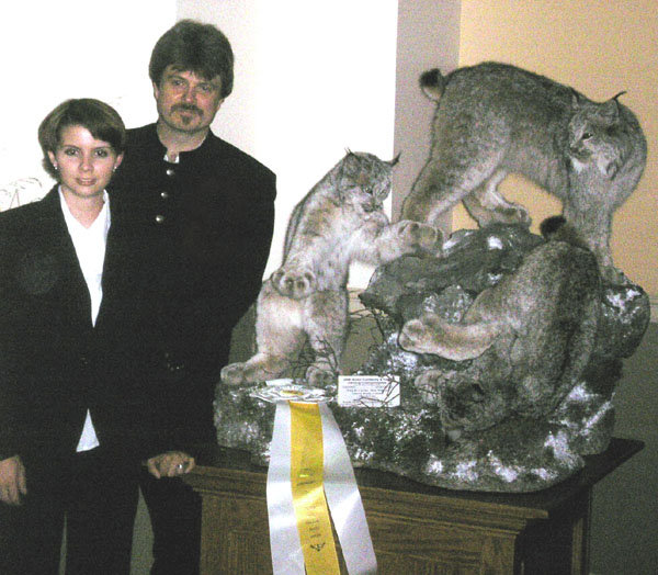 The lynx was mounted on a commercial form which I altered into an open mouth. I made the jawset using a combination of real teeth, cast tongue, and sculptured interior. Robby made the beautiful base for me, and the habitat was created using over twenty artificial rocks which I made with my new silicone molding technique. I entered the lynx in the masters division, and got 1st place (score of 95), along the the people choice "Best Mammal" award!