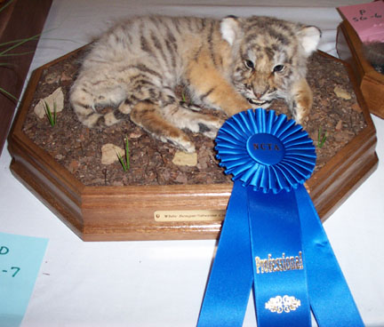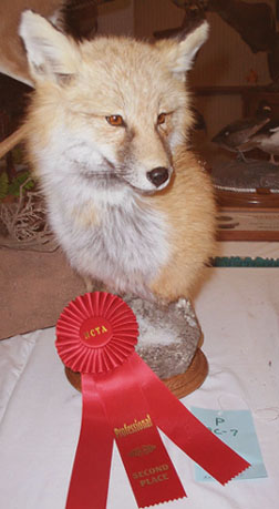 Well, I entered my mounts in the professional division, and... my tiger got a FIRST PLACE, and my fox got a high second (88)! I was thrilled to have recieved these high ribbons. This was my first time competing in professional at the state level. Here are my mounts with their ribbons...