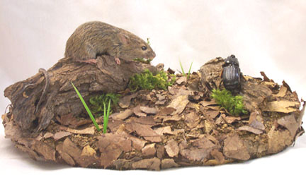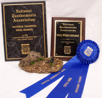 Later at the awards banquet, my mouse was awarded "National Champion Small Mammal", meaning the highest scoring mammal mount in the professional division!! Only three first place ribbons were awarded in the small mammals category, and mine won by one point. This award came with a very nice plaque and $250!! I was also awarded the "Henry Wichers Inchumuk" award, which is given to the highest scoring mammal the size of a squirrel or smaller! Needless to say, I am VERY glad I decided to mount this piece at the last moment!!