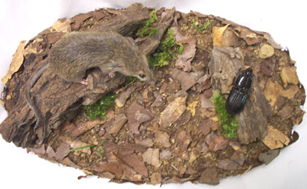 Here are some pictures of my finished mouse. I made a small little base for it out of leaf litter, grass, and moss, similar to my tiger's habitat. The mouse's expression looks like it is intensely staring at something, so I thought it would be a neat idea to put some object in front of it. I wasn't sure what at first... perhaps a flower? Or some kind of food? In the end I decided on a big black beetle. I found it under a log while "habitat-material-hunting" and thought it looked interesting. Plus, mice eat beetles, so you can imagine that the mouse is getting ready to pounce on it. I had to hurry and get this habitat ready.. It will take a little while for everything to dry, and it's just three days till I leave!