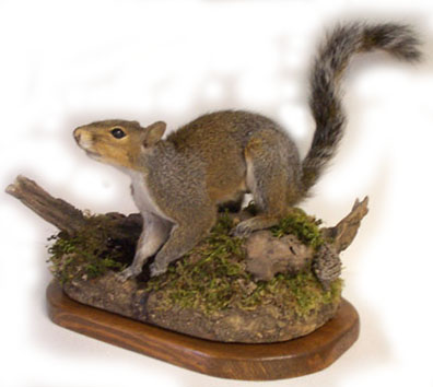 And here is a squirrel I recently completed. I was going to do it for Ebay, but this one turned out so nicely that I decided to keep it for myself. I made the habitat base myself. You can't tell in the picture, but there is a small puddle of artificial water. I also made the wooden base -- cut it out of pine, sanded, and stained it.