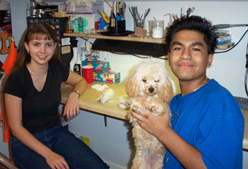 Here's George and I in the shop, working on our rats. We also mounted a teacup poodle! Haha, just kidding.. that's my dog, Miss Prissy!
