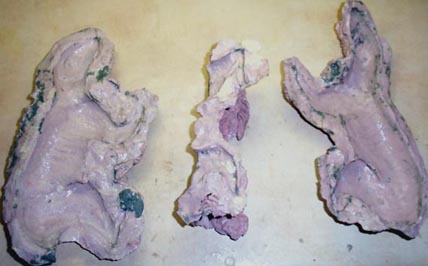 Looking good! After I finished sculpting, I began molding the sculpture. I used bondo, thinned halfway with fiberglass resin to make it pourable. Once the pieces hardened, I reinforced them with a bondo/fiberglass chop mixture on the outside. What made this so different from my previous casting projects was that it was a 3-piece mold rather than just two. It would be impossible to cast a walking squirrel form in a two piece mold. So I made three pieces... one for each side, and another smaller piece that made up the underside and half of each leg. Here's the mold: