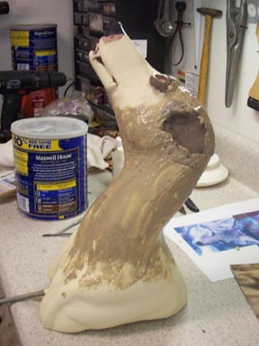 Before I put the skin on, I put hide paste on the form. The head and back of the form are left without paste until the skin is in place, to avoid getting any paste on the fur.