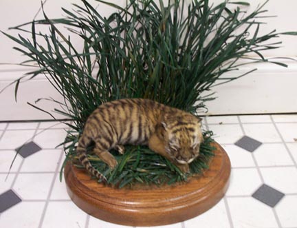 The first is a baby tiger, but alot smaller than the one that I took last year. This one is a full-blooded siberian and only one week old. It is so cute! Due to camera problems I am unable to post a picture of it right now but I will get a picture up just as soon as I can. I mounted it on it's belly in a sleeping position (since it's eyes hadn't even opened yet). I put it on an oval oak base and there are grasses all behind and around the tiger. I dried the grasses out and then spray painted them green and it actually turned out looking quite realistic. A picture is worth a thousand words though, so I will have a picture up on the website soon!